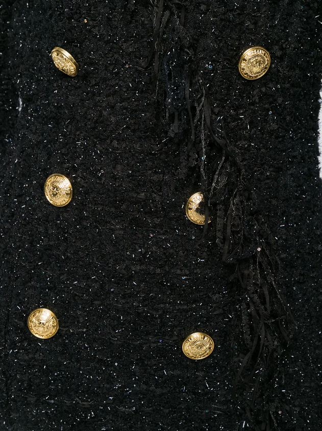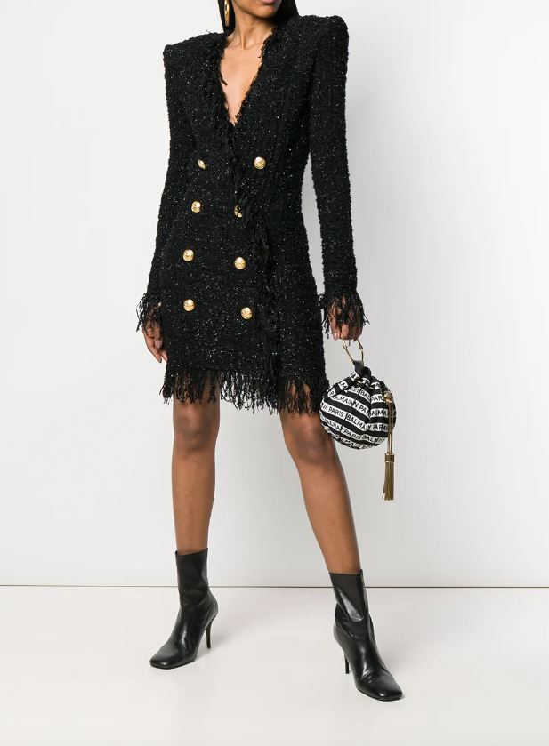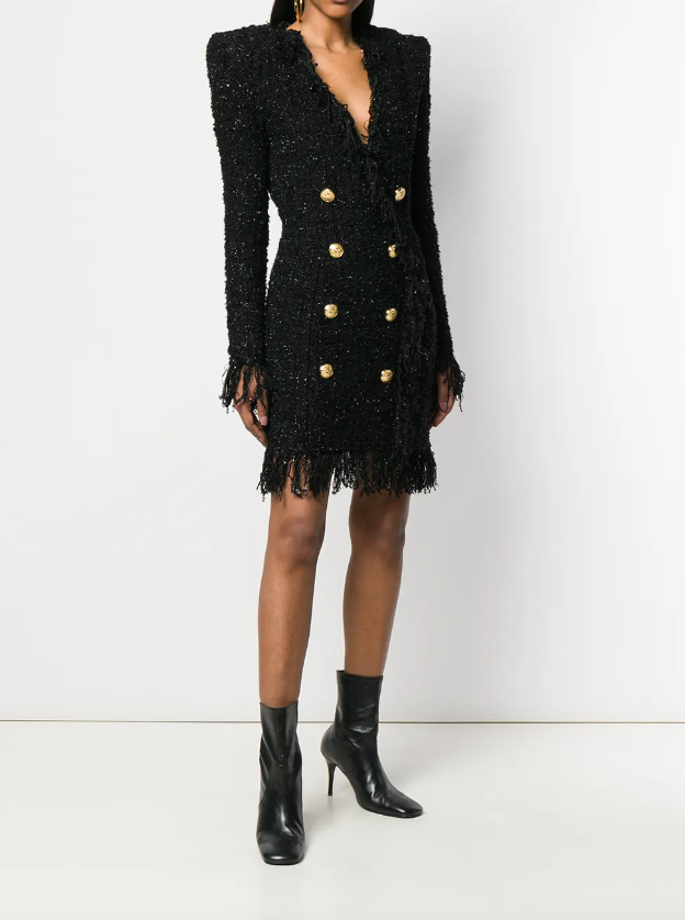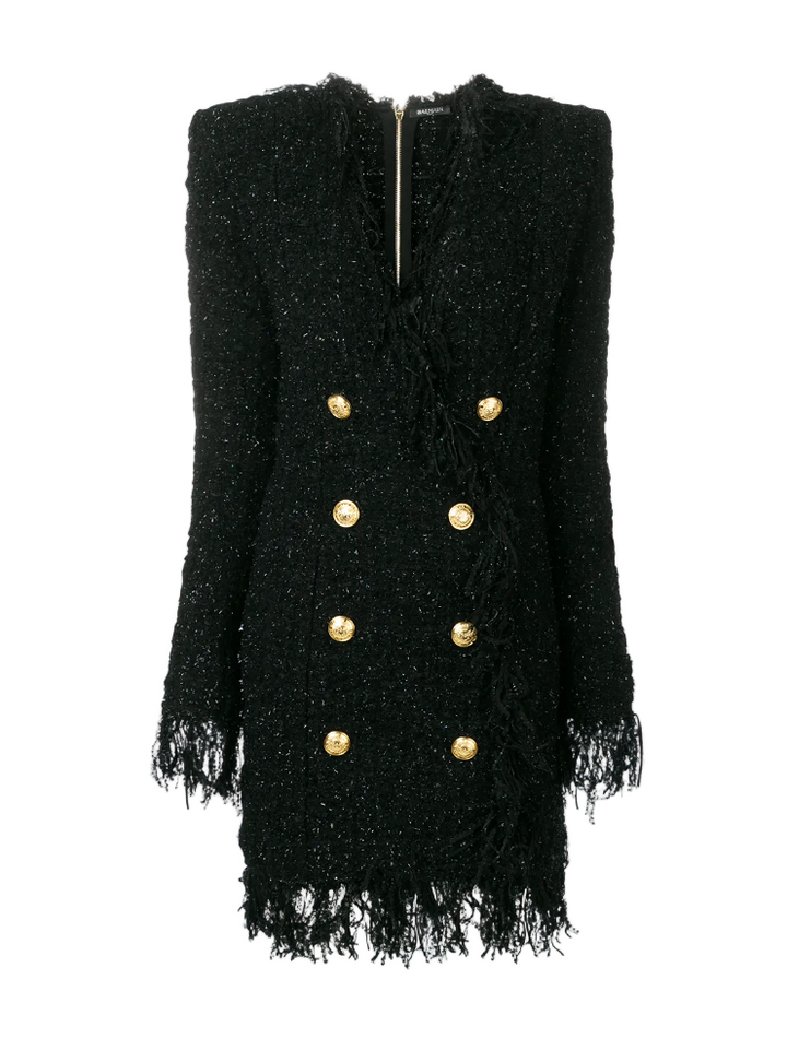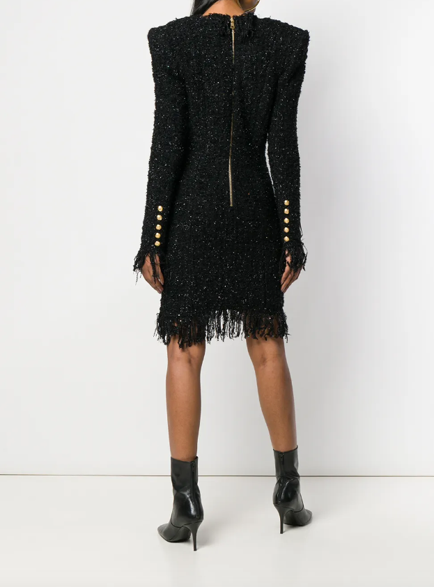 Elevate your wardrobe with this Balmain knitted dress, featuring signature gold buttons that add a touch of refined elegance. Crafted for a sleek, tailored fit, the dress combines luxurious knit fabric with iconic detailing, ensuring both comfort and sophistication. Ideal for upscale occasions, it offers a polished look that embodies timeless Parisian chic.