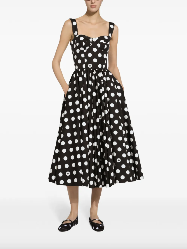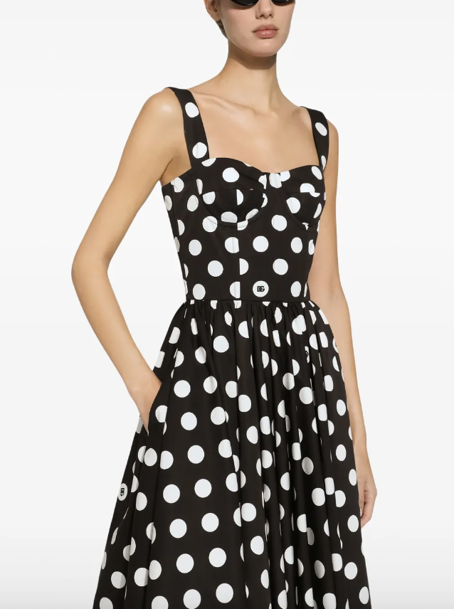 This Dolce & Gabbana polka-dot corset midi dress exemplifies the house's mastery of structured elegance. The fitted corset bodice provides sculpted support and definition, while the midi length offers sophisticated proportions. The iconic polka-dot motif brings a touch of whimsy to the refined silhouette, creating visual depth and movement. Expertly tailored in premium fabrics, this piece transitions seamlessly from daytime events to evening occasions. A standout investment that showcases Dolce & Gabbana's ability to merge architectural tailoring with timeless pattern work.