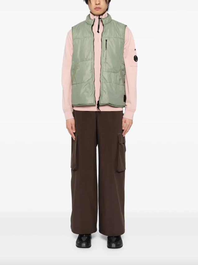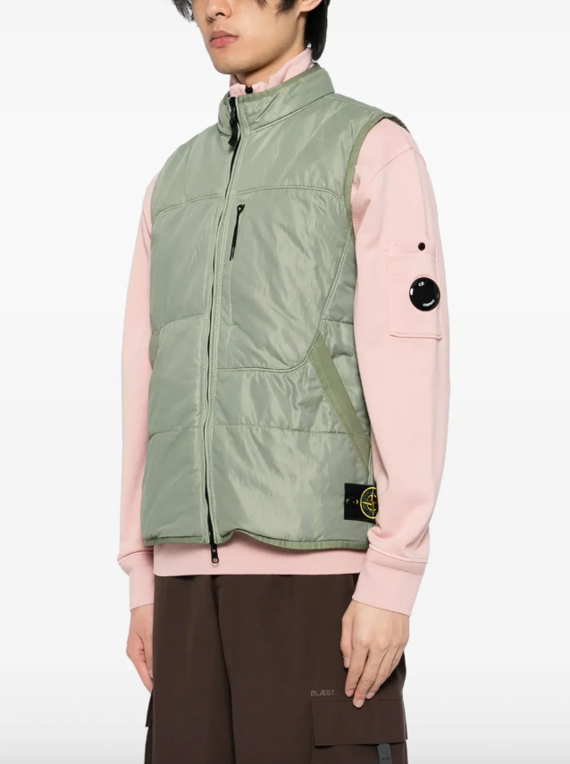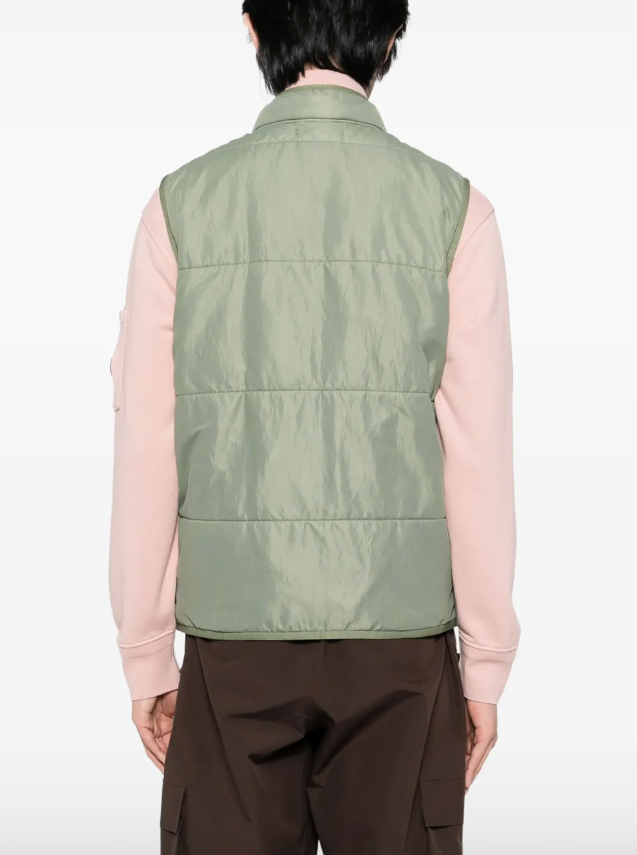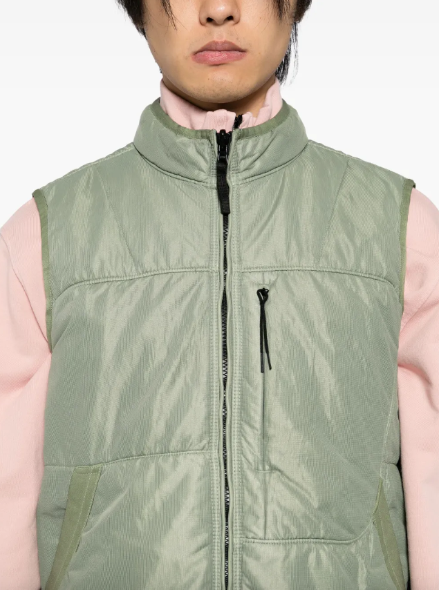 Reversible vest in run-proof nylon mesh on both sides that can be used as a detachable lining through the Stone Island loop tying system, with chest pocket and zip.